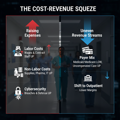 - Non-Labor Costs: This category is by and by the fastest-growing budgetary weight. Supply costs, pharmaceuticals, and obtained organizations (such as IT, counseling, and specialized upkeep) have seen sharp year-over-year increases.