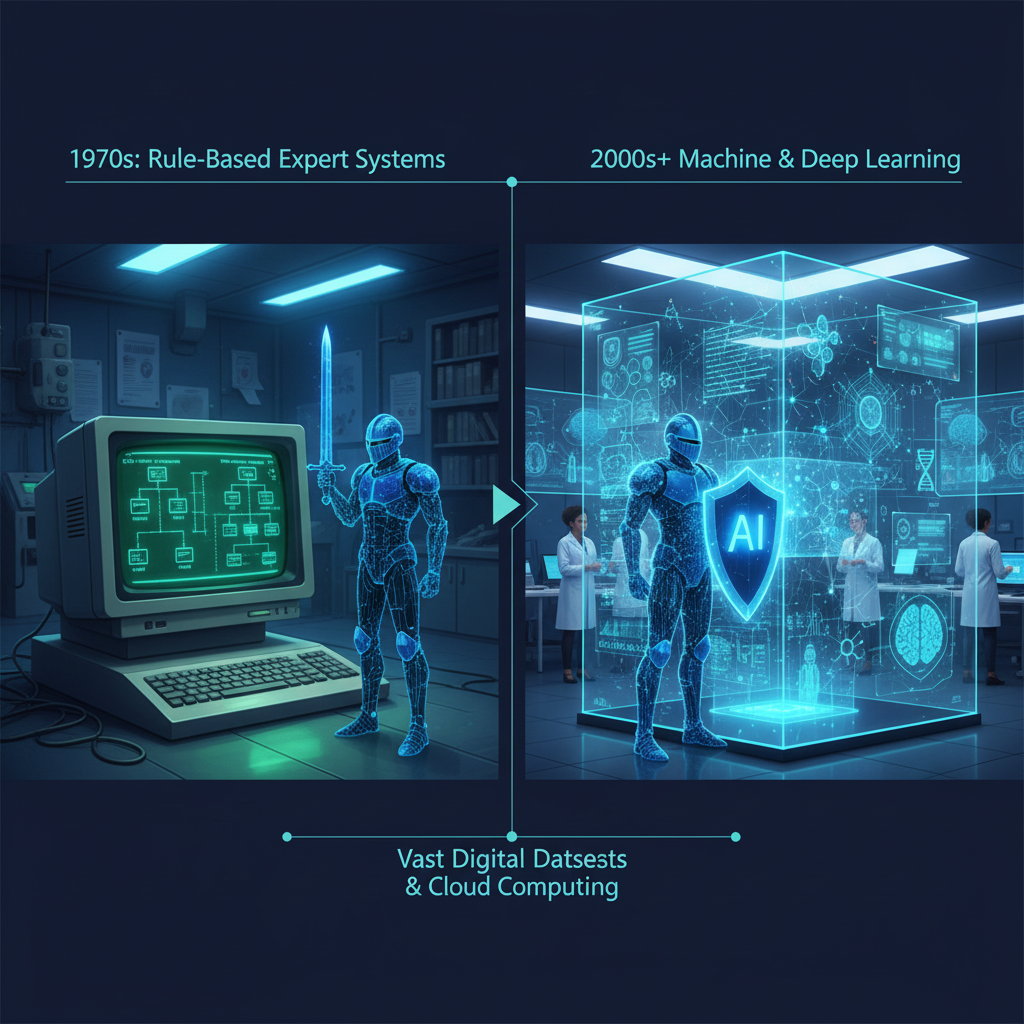 The application of AI in healthcare is not a present day ponder. Its roots can be taken after back to the 1970s with the enhancement of early “ace systems,” such such as MYCIN, an AI program arranged to recognize and recommend treatment for blood infections. These early rule-based systems, while groundbreaking, were obliged by confined computing control and the inconvenience of securing and codifying human authority into settled rules.
